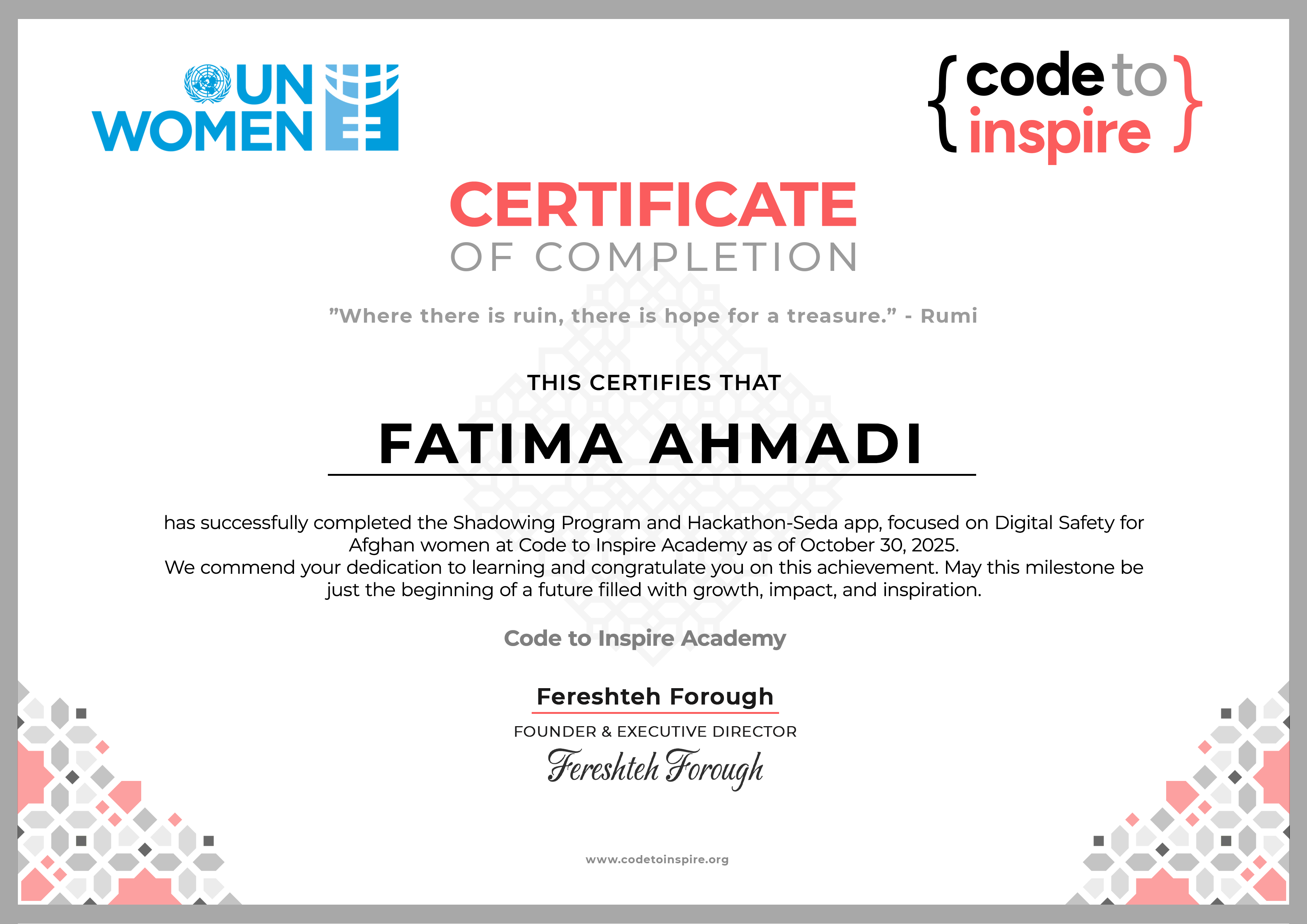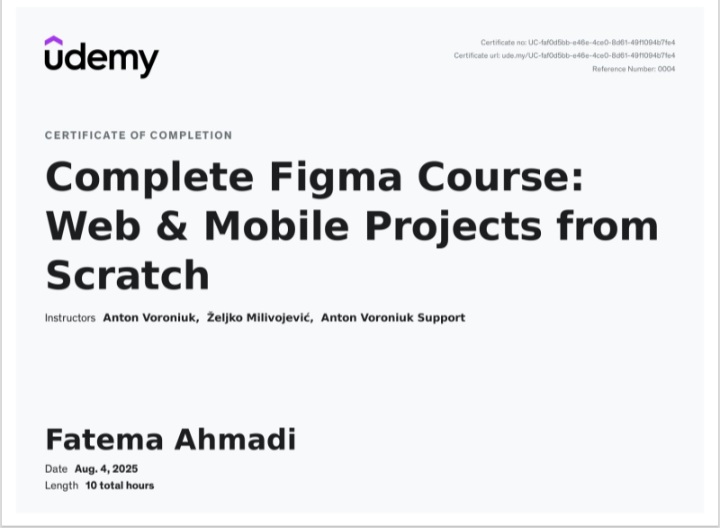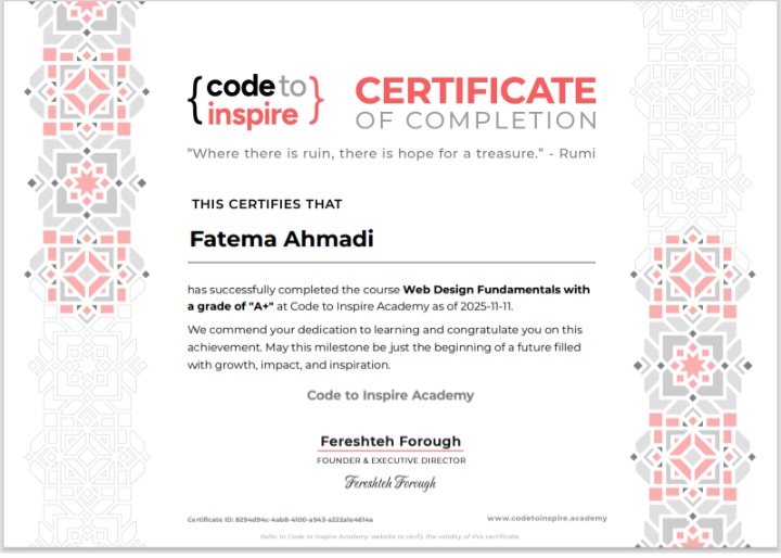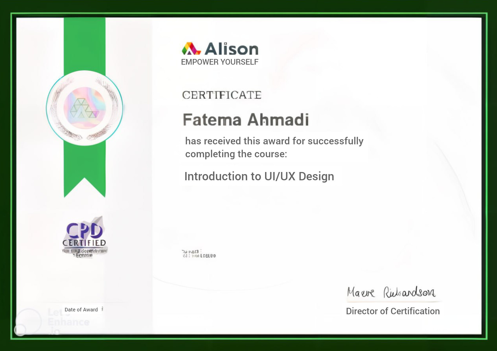 I'm Fatemeh Ahmadi from Herat, Afghanistan a multidisciplinary creator with experience in graphic design, UX/UI design, front-end development, Microsoft Office, and a passion for drawing and calligraphy.